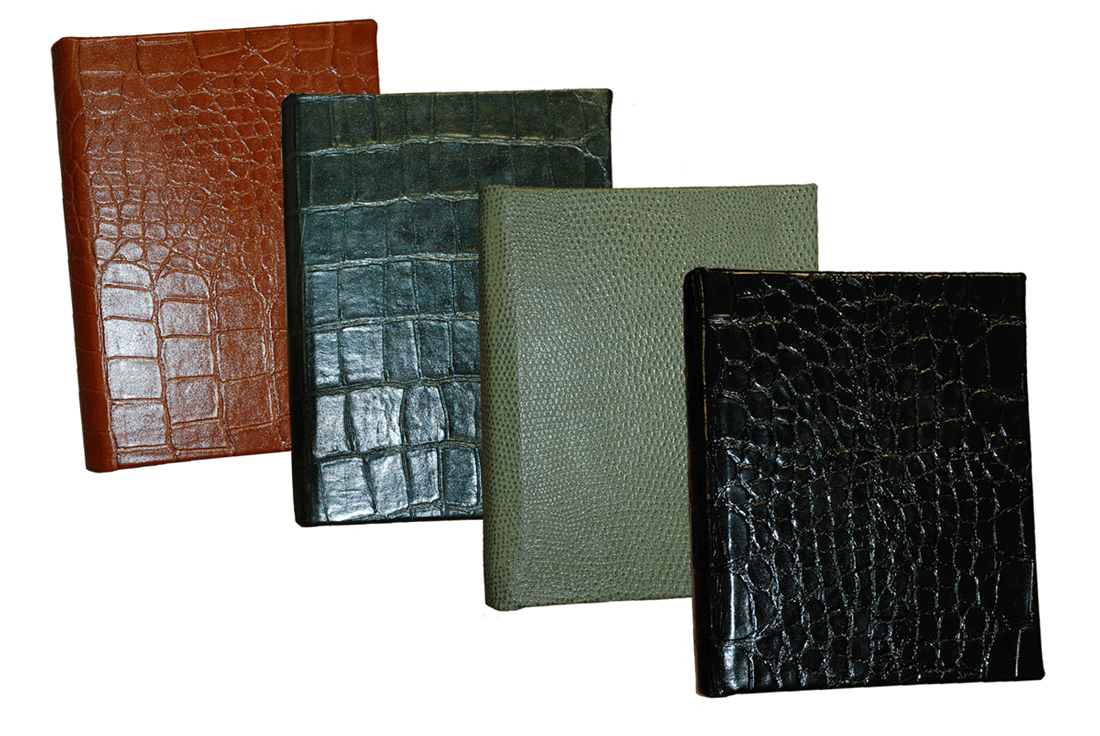 Features: Reptile textured, precision-crafted from the finest genuine leather. Matching moiré lining back color. Glass photo protector. Comes in additional colors and textures - please call for details on production time for custom colors.